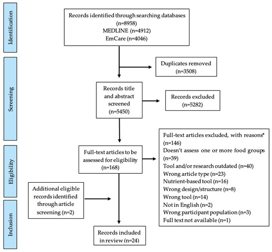Electronic databases, MEDLINE and EmCare were searched until 16 May 2025 using search terms including “diet*”, “healthy eating pattern”, “nutri*”, “food”, “index”, “indic*”, “score”, “tool”, “metric*”, “quality”, “inflammat*” (see Supplementary Table S1 for full search strategy). Articles were limited to those published between 2013 and 2025, reflecting the publishing dates of current national dietary guidelines [19,20,21,22,23], in humans and available in English.