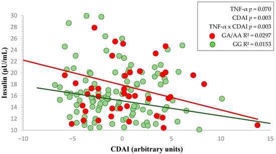 The higher the CDAI, the lower the insulin values appear to be in these subjects (p = 0.151, Table 1). Moreover, subjects with the GA/AA genotypes showed higher, but not statistically significant, raw insulin levels compared to those with the GG genotype (p = 0.087, Table 1). Nevertheless, the higher the CDAI in participants with the TNF-α risk allele A, the more it contributed to reducing the slope of insulin levels compared to volunteers with the GG genotype (p = 0.070, Figure 1). This pattern was supported by a statistically significant interaction between CDAI and TNF-α genotype (p = 0.003, Figure 1), suggesting a potential effect modification associated with the genetic make-up.