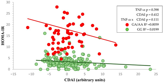 In a similar way, the interaction between HOMA-IR and CDAI related to TNF-α -308 rs1800629 genotypes (GG and GA/AA) is illustrated (Figure 2), although the slope is similar, the results are not statistically significant.