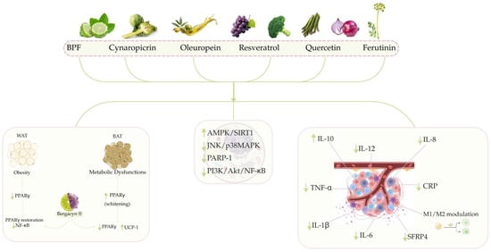 BPF, cyn, oleuropein, RV, quercetin, and ferutinin are able to modulate inflammatory pathways including AMPK/SIRT1, JNK/p38MAPK, PARP-1, and PI3K/Akt/NF-κB; modulate the secretome of tumor cells by reducing the secretion of pro-inflammatory cytokines (IL-12, IL-8, CRP, SFRP4, IL-6, IL-1β, TNF- α) and increasing the secretion of anti-inflammatory cytokines (IL-10), and modulate the activation state of macrophages. Bergacyn® restored PPARγ levels and prevented NF-κB overexpression in obese WAT, where PPARγ is significantly reduced. Whereas, in BAT, despite the increased expression of PPARγ, during metabolic dysfunction and “whitening,” Bergacyn® reduced PPARγ. Restoration of adipose tissue homeostasis and regulation of PPARγ by Bergacyn® could reduce inflammation and metabolic signals involved in some cancers. The arrows indicate decrease (↓) and increase (↑), respectively. Bergamot polyphenolic fraction (BPF); cynaropicrin (cyn); resveratrol (RV); AMP-activated protein kinase/silent mating type information regulation 2 homolog 1 (AMPK/SIRT1); c-Jun amino-terminal kinase/p38 mitogen-activated protein kinase (JNK/p38MAPK); poly (ADP-ribose) polymerase-1(PARP-1); phosphatidylinositol 3-kinase/protein kinase B/Nuclear factor kappa-light-chain-enhancer of activated B cells (PI3K/Akt/NF-κB); interleukin-12, -8, -6, -1β, -10 (IL-12, -8, -6, -1β, -10); C reactive protein (CRP); secreted frizzled-related protein 4 (SFRP4); tumor necrosis factor alpha (TNF- α); peroxisome proliferator-activated receptor-gamma (PPARγ); brown adipose tissue (BAT); white adipose tissue (WAT).