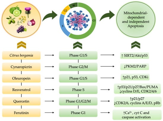 The anti-proliferative effects of natural extract derivatives on different cancer cell types were evaluated through cell cycle arrest in multiple in vitro studies. Citrus bergamia has been shown to possess an antiproliferative effect by arresting the cell cycle in the G1/S phase through the modulation of the SIRT2/Akt/p53 pathway. Cynaropicrin arrested the cell cycle in the G2/M phase by modulating the PKM2/PARP pathway. Oleuropein exerts an antiproliferative effect by arresting the cell cycle in the G1/S phase by increasing p21/p53/CDKi. RV treatment arrested the cell cycle in the S phase by modulating p53/p21/p27/Bax/PUMA and the reduction in cyclins D/E and CDK 2/4/6. Treatment with quercetin causes cell cycle arrest in G1/G2/M phases with the modulation of p21/p27 and reduction in CDK 2/6 and cyclins A/E/D and phosphorylation of Rb. Ferutinin treatment has been shown to exsert an antiproliferative effect leading to cell cycle arrest in the G1 phase by increasing intracytoplasmic Ca 2+ concentration, inducing cyt C release and caspases activation. The arrows indicate decrease (↓) and increase (↑), respectively. Silent mating type information regulation 2 homolog 2 (SIRT2); protein kinase B (Akt); tumor protein p53 (p53); Cynaropicrin (Cyn); Pyruvate kinase M2 (PKM2); poly-ADP-ribose-polymerase (PARP); tumor protein p21/p53; Cyclin-dependent kinase inhibitor (CDKi); Resveratrol (RV); p53/p21/p27; BCL2 associated X, apoptosis regulator (Bax); p53 upregulated modulator of apoptosis (PUMA); Cyclin-dependent kinases (CDK 2/4/6); Cytochrome C (Cyt C).