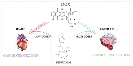 The tissue-dependent and dose-dependent effect of ferutinin. At low doses, ferutinin ca counteract the cardiotoxic effect of Dox. At high doses, ferutinin can enhance Dox chemosensitization in tumor tissues. Doxorubicin (Dox).