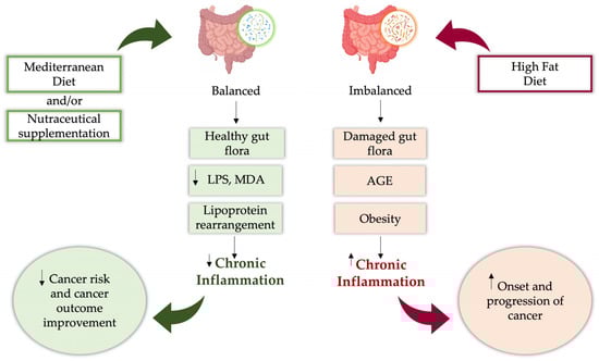 Mediterranean-style dietary model and/or nutraceutical supplementation are directly related to health gut microbiota. The MedDiet, rich in fiber and natural compounds such as polyphenols, supports a balanced microbiota, reduces inflammation, LPS and MDA levels, promotes lipoprotein rearrangement, and contributes to reduction in cancer risk and cancer outcome improvement. Controversially an HFD alters the composition of the microbiota, promoting AGEs production, with increased chronic inflammatory state—associated with obesity, and activating the gut–bone marrow–tumor axis, resulting in increased onset and progression of cancer. The arrows indicate decrease (↓) and increase (↑), respectively. Mediterranean Diet (MedDiet); lipopolysaccharide (LPS); malondialdehyde (MDA); high fat diet (HFD); advanced glycation end product (AGE).