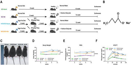 T2DM experimental animals exhibited metabolic disorders that were alleviated by butyrate. (A) Schematic diagram for the animal treatment. T2DM mice were constructed via a high-fat diet in conjunction with STZ injection. Sodium butyrate was administered for 12 weeks. (B) Molecular structure of compound sodium butyrate (SB). (C) Body scales of mice in different groups were displayed. (D) Body weights of mice were monitored at four-week intervals during the dosing period. (E) Fasting blood glucose (FBG) of mice was monitored at four-week intervals during the dosing period. (F) Intraperitoneal glucose tolerance test (IPGTT) with blood glucose measured every 30 min (n = 5 per group, one-way ANOVA test). ns: not significant, * p < 0.05, *** p < 0.001, ****p < 0.0001.