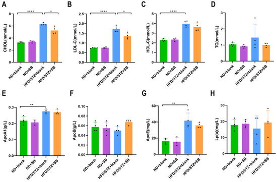 Given the observed protective effects of butyrate against HFD-induced adiposity in T2DM mice, we further assessed lipid metabolism by measuring a panel of serum lipid markers, including TG, CHOL, LDL-C, HDL-C, ApoA1, ApoB, ApoE, and Lp. T2DM mice exhibited significantly elevated levels of CHOL, LDL-C, HDL-C, ApoA1, and ApoE compared to those on a normal diet (Figure 2B–E,G). Notably, butyrate supplementation effectively reduced CHOL and LDL-C levels in HFD/STZ mice (Figure 2A,B).