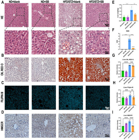 The liver serves as the primary site for CHOL and LDL production under both normal and diabetic conditions. HE staining revealed extensive lipid vacuole formation in the hepatocytes of untreated diabetic mice (Figure 3A), while Oil Red O and Filipin III staining demonstrated significant reductions in total hepatic lipid and CHOL accumulation, respectively, following butyrate treatment (Figure 3B,C,G,H). The NAFLD activity score (NAS) was calculated based on the Kleiner scoring system, comprising three components: steatosis (0–3), lobular inflammation (0–3), and hepatocellular ballooning (0–2). Liver sections were evaluated under light microscopy by two independent pathologists blinded to the group assignment, and the mean score was used for statistical analysis [16]. Consistent with a previous study showing that butyrate administration ameliorates hepatic fibrosis and steatosis in HFD-fed mice [17], we observed significantly increased liver weights and NASs in the HFD/STZ + blank group, which were substantially reduced following butyrate supplementation (Figure 3E,F). In addition, a clear downregulation of HMGCR expression in the liver was observed in the butyrate-treated group, suggesting reduced endogenous cholesterol production (Figure 3D,I).
