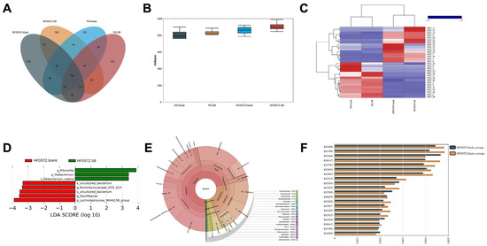 A total of 2541 OTUs were clustered from high-quality reads at 97% sequence identity. The Venn diagram illustrated the distribution of OTU richness across the four experimental groups (Figure 5A). Alpha diversity, which reflects species richness within individual samples, showed no significant differences among the groups based on the Shannon index (Figure 5B). In contrast, beta diversity analysis—used to assess compositional differences between groups—revealed distinct clustering types in the heatmap based on genus-level taxonomy (Figure 5C). To further investigate microbial shifts after butyrate diet, we used LEfSe to identify differentially abundant taxa between the two diabetic groups. The relative abundance of Rikenella and Lleibacterium associated with host lipid metabolism and inflammatory responses was decreased, whereas SCFA productors—Ruminococcaceae, Oscillibacter, and Lachnospiraceae—were significantly increased after butyrate supplementation (Figure 4D). The bacterial cladogram at the OTU level also highlighted a distinct dominant lineage in HFD/STZ +SB mice (Figure 5E). To investigate the functional potential of the gut microbiota, we identified twenty KEGG pathways with differentially enriched OTUs. Among them, five pathways—including K00059 (fabG), K02003 (ABC.CD.A), K02004 (ABC.CD.P), K01192 (ribulose-5-phosphate 3-epimerase), and K01990 (transketolase)—were associated with lipid metabolism in this diverse environment (Figure 5F).