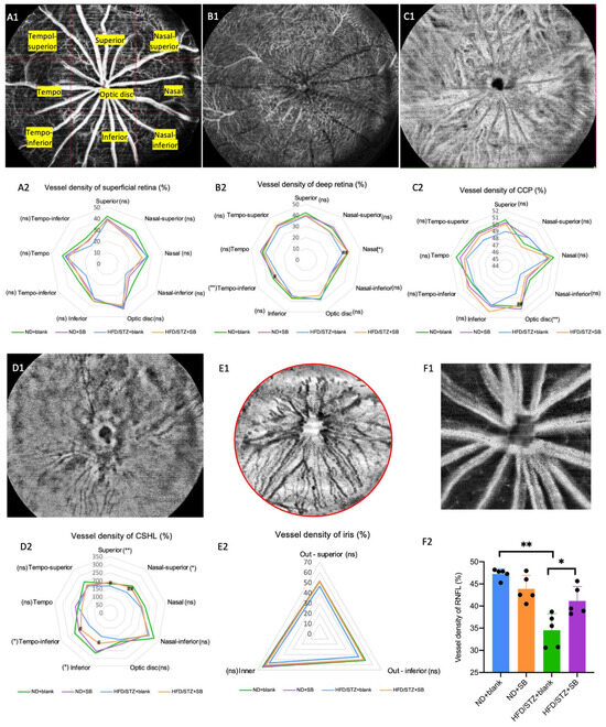 WFSS-OCTA detected vascular density changes in the T2DM mice. 3 × 3 grids (comprising nine rectangles: tempo-superior, superior, nasal-superior, tempo, optic disc grid, nasal, tempo-inferior, inferior, and nasal-inferior) with a total area of 24 mm × 24 mm of retina–choroid, iris, and pRNFL en face OCTA images were chosen to analyze the vessel density parameters. Representative OCTA en face images and statistical analysis showing the superficial retina (A1,A2), deep retina (B1,B2), CCP (C1,C2), CSHL (D1,D2), iris (E1,E2), and pRNFL (F1,F2). n = 5 mice per group, one-way ANOVA test. ns: not significant, * p < 0.05, ** p < 0.01 (HFD/STZ + SB group compared with ND + blank group), # p < 0.05, ## p < 0.01 (HFD/STZ + SB group compared with HFD + blank group).