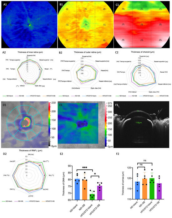 WFSS-OCTA detected ocular thickness alteration in the T2DM mice. 3 × 3 grids (comprising nine rectangles: tempo-superior, superior, nasal-superior, tempo, optic disc grid, nasal, tempo-inferior, inferior, and nasal-inferior) with a total area of 24 mm × 24 mm of retina–choroid, pRNFL, and GMA en face OCTA images were chosen to analyze the thickness parameters. Representative images and statistical analysis show the inner retina (A1,A2), outer retina (B1,B2), choroid (C1,C2), pRNFL (D1,D2), GMA (E1,E2), and corneal (F1,F2). n = 5 mice per group, one-way ANOVA test. ns: not significant, * p < 0.05, ** p < 0.01, *** p < 0.01 (HFD/STZ + SB group compared with ND + blank group), # p < 0.05, ## p < 0.01 (HFD/STZ + SB group compared with HFD + blank group).