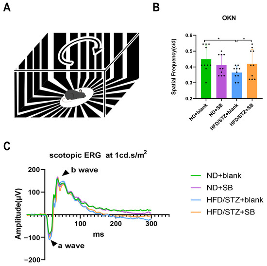 Although dark-adapted ERG revealed no significant changes in a- or b-wave amplitudes post-treatment, OKN tests showed a slight decrease in visual perception in HFD/STZ mice, which was partially restored by butyrate supplementation (Figure 8).