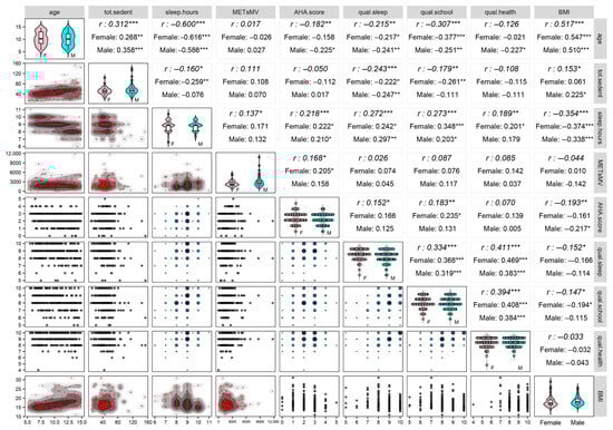 - Providing preliminary descriptive statistics and nonparametric significance tests [23]. Preliminarily, the sex-by-age-classes distribution of the 225 participants was inspected by testing the equality of age distribution between females and males (or, equivalently, the equality of sex distribution across age classes) through the Chi-square test (with a Monte Carlo (MC) procedure to obtain the p-value). Next, descriptive statistics of anthropometric, hemodynamic, and lifestyle variables and perceived quality scales were computed as median ± MAD (Median Absolute Deviation) both within sex and age classes and over all the participants. Then, we performed the two-tailed Kruskal–Wallis and median MC tests for each variable to evaluate the null hypothesis of the absence of differences between males and females and across age classes. Besides this, we constructed the correlogram of the ten variables we selected for their relevance to our investigation, i.e., sex (used as a stratification variable), age, BMI, lifestyle variables, and perceived quality scales (Appendix A Table A1). Spearman’s rank correlation coefficients were reported for every pair of variables on the upper triangular part of the correlogram, along with significance test results for uncorrelation concerning the whole set of 225 participants and the distinction between females and males. Moreover, on the correlogram diagonal, graphs displaying the univariate within-sex distributions were built for each variable, while in the lower triangular part, bivariate plots displaying the joint distributions of each pair of variables were built consistently with their measurement level.