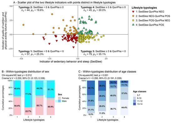 - Defining lifestyle typologies based on the obtained lifestyle indicators. We set up lifestyle typologies of children and teens by combining their negative or nonnegative (i.e., positive or equal to zero) scores on the lifestyle indicators. Nonnegative scores on all indicators characterized the healthiest lifestyle typology, while negative scores denoted the least healthy lifestyle typology; additionally, indicator scores with discordant signs defined intermediate typologies. Once the typologies were defined, we analyzed the sex and age classes composition of each of them to disclose any possible differences. In particular, we tested the equality of sex and age-class distributions across the typologies through the Chi-square MC test. Cramer’s V, along with 95% bootstrap CIs (built with the BCa method based on B = 1000 bootstrap samples), was also computed to provide a measure of the strength of association between lifestyle typologies and sex, and lifestyle typologies and age classes, respectively.