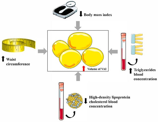 Jafari et al. conducted a study that assessed the influence of the VAI calculated at the beginning of a 10-year follow-up period on the risk of developing MetS. The analysis included 1084 healthy adults aged 15 to 75, 506 of whom developed MetS during the follow-up period. It was found that an increased VAI significantly increased the risk of MetS [adjusted OR (aOR): 2.57; 95% CI: 1.60–4.12] (OR adjusted for age, sex, job, education, physical activity, smoking, opium consumption, cholesterol, blood pressure, and low-density lipoprotein cholesterol) [60].