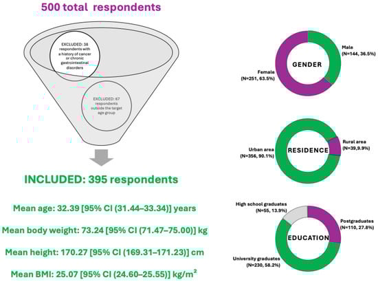 A total of 500 individuals completed the questionnaire. After applying the predefined eligibility criteria—specifically, excluding individuals under the age of 18 or over 50 (67 respondents), and those reporting a history of cancer or chronic gastrointestinal disorders (38 respondents)—a total number of 105 responses were excluded, resulting in a final sample of 395 participants included in the current analysis.
