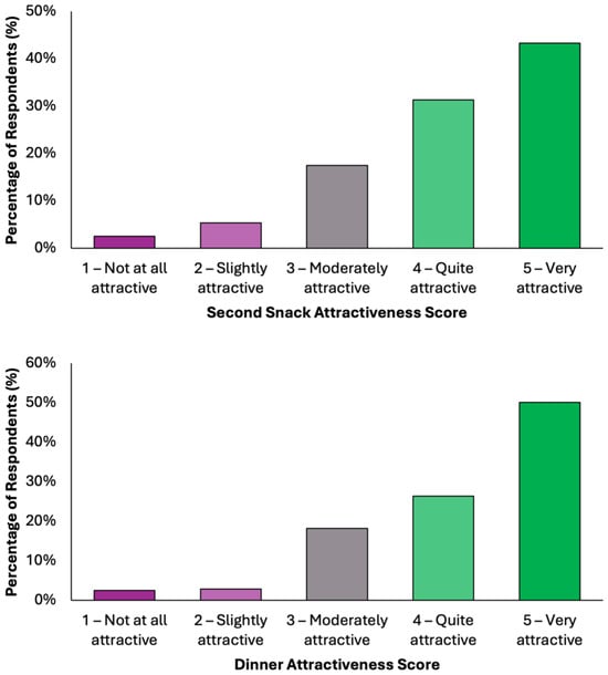 Summary of respondents’ perceived attractiveness of the proposed colorectal cancer-preventive diet, evaluated for every meal using a 5-point Likert scale, where 1 indicated “not attractive at all” and 5 indicated “very attractive”.