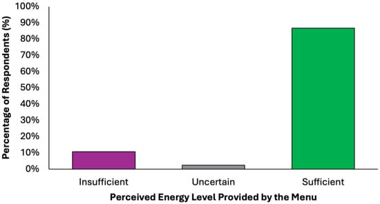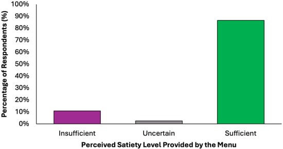 The perceived adequacy of satiety and energy provided by the proposed colorectal cancer prevention diet was assessed using a closed-ended question with five response options (Figure 6). A substantial majority of respondents (77.2%, N = 305) agreed that the menu was sufficient both in terms of satiety and daily energy needs, suggesting that the diet was generally perceived as balanced and nutritionally complete. Two subgroups of partial agreement were identified: 9.6% (N = 38) of respondents reported that the diet provided adequate energy but lacked satiety, while 9.4% (N = 37) found it satisfying in terms of fullness but insufficient in energy content. These nuanced responses suggest that while most participants perceived the menu positively, a notable minority highlighted areas where macronutrient balance or caloric density might require individual adjustments. A small percentage of participants expressed uncertainty (2.5%, N = 10) or a clearly negative assessment (1.3%, N = 5), stating that the menu was insufficient in both energy and satiety. These results confirm a very high level of perceived satiety (N = 380, 96.2%) and strong perceived energy adequacy (N = 348, 88.1%), with a minority of undecided or negative responses in both domains.