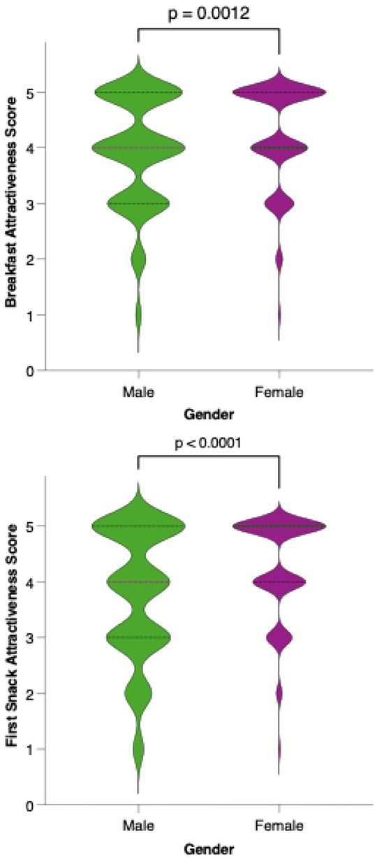 Analysis of meal-specific attractiveness ratings revealed notable differences in perception between female and male participants for all proposed menu items (Figure 11). For each meal—breakfast, first snack, lunch, second snack, and dinner—female respondents consistently rated the attractiveness of the options higher than their male counterparts. None of the meals reached a level of equal acceptability across genders, as reflected by statistically significant differences (p < 0.05) in the Mann–Whitney U tests for all comparisons. This pattern suggests that, while the dietary model is generally well received, its universal appeal is limited by gender-based preferences.