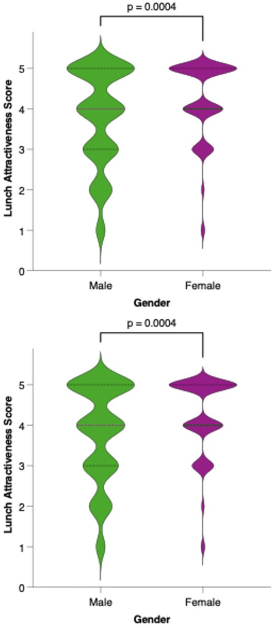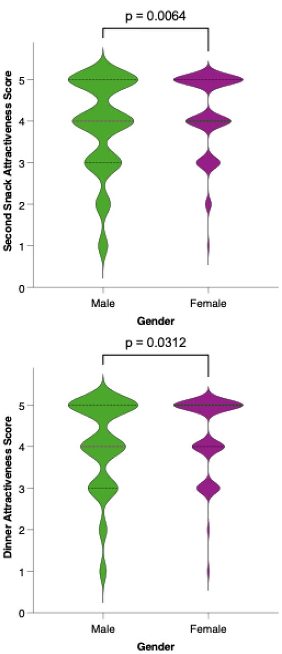 Perceived attractiveness of each proposed meal in the colorectal cancer-preventive diet by gender. Violin plots show the distribution of attractiveness ratings (1–5 Likert scale) for female (red) and male (blue) participants. The bold horizontal line within each violin indicates the group mean. Note: Statistically significant difference in Mann–Whitney U test as indicated by the asterisk and significance line above the plot.
