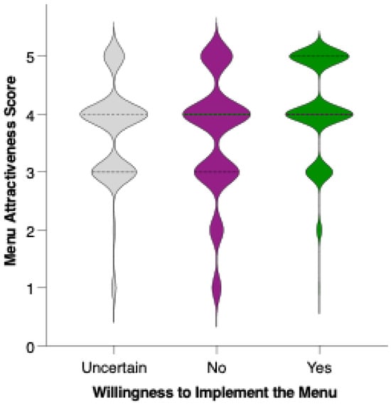 Perceived attractiveness of the proposed colorectal cancer-preventive diet by willingness to replace the usual menu. Violin plots show the distribution of attractiveness ratings (1–5 Likert scale). The bold horizontal line within each violin indicates the group mean. Note: Statistically significant difference in Mann–Whitney U test as indicated by the asterisk and significance line above the plot.