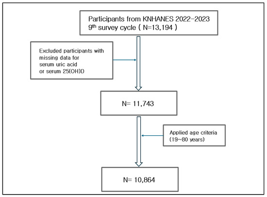 Flowchart of participant selection. This figure outlines the selection process for study participants from the 9th KNHANES (2022–2023), starting with 13,194 individuals. After excluding those with missing data (serum uric acid or 25(OH)D levels), 11,743 participants remained. Applying the age criterion (19–80 years) further reduced the sample to 10,864 participants, who were included in the final.