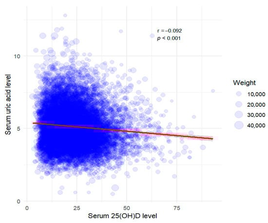 Weighted scatter plot with regression line for serum 25(OH)D vs. serum uric acid. The red line represents the linear regression model, accounting for sampling bias with applied weights. Pearson’s correlation coefficient (PCC) was −0.092 (p-value < 0.001). Data points are scaled according to sampling weights.