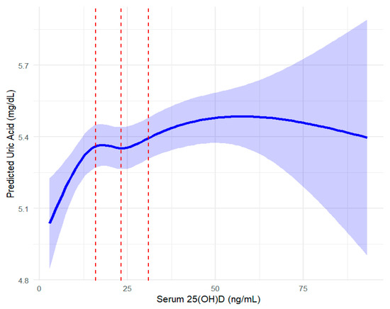 However, existing studies examining the association between vitamin D and uric acid have reported inconsistent findings, including positive, negative, and non-linear associations, likely due to differences in study design, population characteristics, and environmental factors [12,13,14]. Although sufficient vitamin D levels have generally been associated with lower serum uric acid concentrations, the nature of this relationship under vitamin D-insufficient conditions remains unclear, with inconsistent findings across studies [13,15].