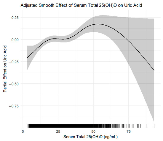 Generalized additive model (GAM) depicting the adjusted smooth effect of serum total 25-hydroxyvitamin D [25(OH)D] on serum uric acid levels. The curve shows the partial effect of 25(OH)D after adjusting for key confounders including age, sex, BMI, alcohol use, creatinine, chronic diseases, dietary intake, and lipid profiles. Shaded area represents the 95% confidence interval.