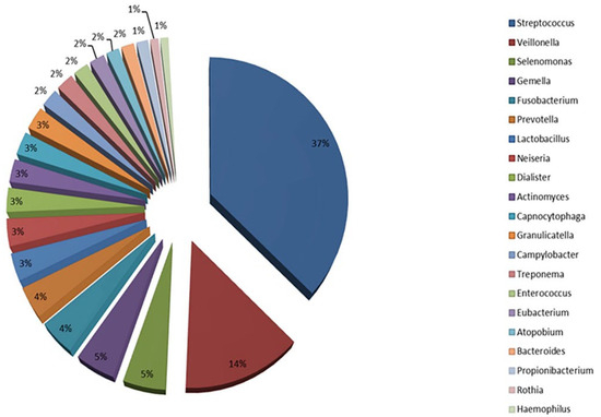 The main relative members of the phyla of oral microbiota. Modified from Santacroce et al. [27] under the terms of the Creative Commons Attribution—NonCommercial 4.0 License https://creativecommons.org/licenses/by-nc/4.0/ (accessed on 5 May 2025) which permits non-commercial use, reproduction and distribution of the work without further permission provided the original work is attributed. Source: HOMD, http://www.homd.org/ (accessed on 5 May 2025).