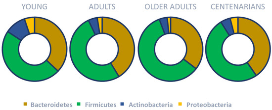 Interestingly, centenarians tend to have more diverse gut microbiota compared to the average older population. While Bacillota remain prominent, the Bacillota/Bacteroidota ratio is generally lower. In Chinese centenarians, higher levels of beneficial Lactobacillaceae, known for their anti-inflammatory and antioxidant properties, have been reported [69]. In Sardinian centenarians, Faecalibacterium prausnitzii and Agathobacter rectalis (formerly Eubacterium rectale) are depleted, while Methanobrevibacter smithii and Bifidobacterium adolescentis are enriched compared to younger individuals [70], while only mild increases in Pseudomonadota, particularly Escherichia coli have been documented [67,70,71]. Age-related microbial shifts are therefore influenced not only by chronological age but also by several factors such as the use of multiple medications including antibiotics, proton pump inhibitors, and laxatives, chronic conditions, immune system aging (i.e., immunosenescence), increased gut permeability to lipopolysaccharides, and changes in diet and lifestyle, but also by individual genetic predisposition [62,63,72,73,74,75].