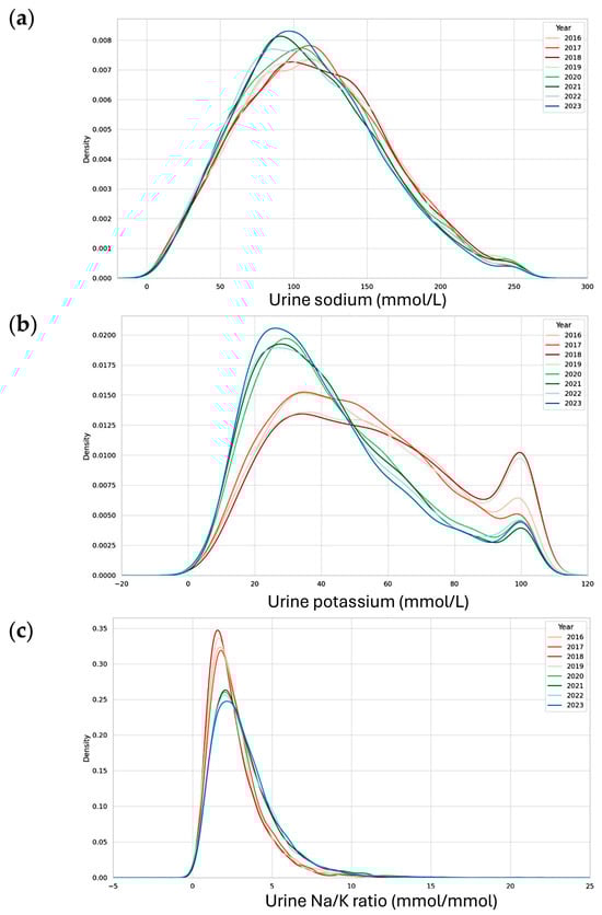 Among the analytes examined, urinary K showed the most prominent change in distribution, which in turn influenced the shape of the Na/K ratio distribution curves during the corresponding years. These alterations in urinary Na and K concentrations were also reflected in the Na/K ratio plots, which exhibited similar inflection patterns beginning in 2020 and continuing through 2023.