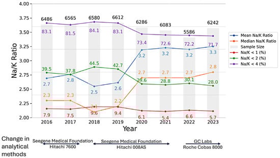 In the present study, the measurement device for urinary electrolytes was changed in 2018, while remaining within the same testing institution, and both the testing laboratory and measurement equipment were changed again in 2022 [8]. There was no substantial difference in urinary electrolyte results between the periods 2016–2019 and 2020–2023 in relation to the assay change. Rather, noticeable changes began to emerge, starting in 2020. Following the outbreak of COVID-19 in late 2019, public health measures in Korea, including self-quarantine and social distancing, led to substantial lifestyle changes. These shifts may have influenced dietary habits and fluid intake, potentially contributing to the observed urinary electrolyte profiles and the prevalence of high Na/K ratios before and after the pandemic [23]. Further longitudinal studies are warranted to determine whether these patterns persist and to assess their long-term implications for public health.