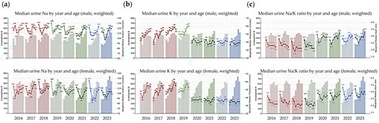 Median urinary sodium (Na), potassium (K), and Na/K ratio, along with the number of participants by sex, age group, and year. (a) Median urinary sodium concentration; (b) median urinary potassium concentration; and (c) median urinary Na/K ratio. Line graphs represent the median urinary Na, K, and Na/K ratio stratified by sex and age group for each year from 2016 to 2023 (males in the top panels, females in the bottom). Bar graphs in the background indicate the number of participants (n) in each corresponding age group and year.
