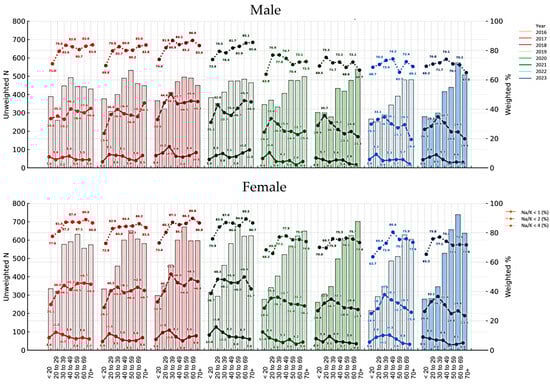 When applying Na/K ratio thresholds of <1, <2, and <4, a decreasing trend in the prevalence of each category was observed over time, with the exception of 2018 and 2019. From 2016 to 2023, the proportion of participants with Na/K ratios below these thresholds gradually declined, while the proportion with Na/K ratios ≥4 appeared to increase over the same period. The prevalence of Na/K ratio thresholds stratified by sex and age group is presented in Figure 4 and Figure 5. The prevalence of a Na/K ratio ≥2 increased from 60.5% to 72.0%, and that of a ratio ≥4 increased from 16.9% to 28.3%. A U-shaped trend in Na/K ≥4 prevalence was observed by age, highest among those <20 and ≥70 years. Males had a higher prevalence than females in all age groups except 20–29.