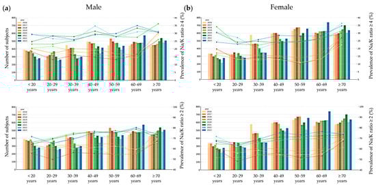Prevalence of urinary sodium-to-potassium (Na/K) ratios ≥ 4 (top) and ≥ 2 (bottom) by age group and survey year with participant counts in male (a) and female (b) subjects. Bar graphs in the background indicate the number of participants (n) in each corresponding age group and year (left y-axis).