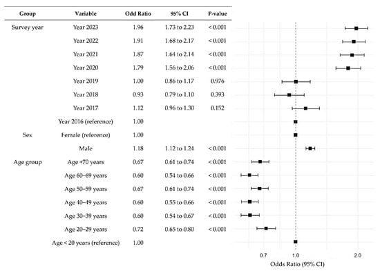 Since the prevalence of a Na/K ratio ≥2 was observed in more than half of the participants, a logistic regression analysis using a GLM with a complex sampling design was conducted to investigate factors associated with a high Na/K ratio (≥4), which is considered a feasible target according to the Japanese guidelines (Figure 6). Age group, survey year, and sex were found to be significantly associated with having a Na/K ratio ≥4.