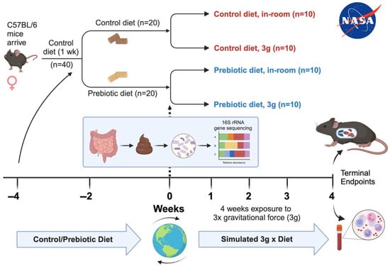 Female, 9-week-old C57BL/6 mice (10/group, 5 mice per cage, 40 mice total) were ordered from Jackson Laboratories and shipped to the NASA Ames Research Center Animal Care Facility (Moffett Field, CA, USA). Only female mice were studied because NASA primarily sends female mice into space due to total weight constraints during spaceflight. The temperature was maintained at an average recorded room temperature of 21 °C, while humidity was maintained between 30 and 50% throughout the experiment. The Institute for Animal Care Use Committee approved the protocol under Protocol Number: NAS-19-004-Y3. All mice were housed in disposable cages (Lab Products, LLC, Aberdeen, MD, USA) before and after transfer to the centrifuge facility. Mice received food/water ad libitum. Water was provided by HydroGel packs (NewCo Distributors, Inc., Cucamonga, CA, USA). Cages, food, and gel packs were changed twice per week. Weekly fecal pellets were also collected from a clean cage for each individual animal during cage changes to minimize disruption to the animals. At the end of the experiment (Figure 1), mice were euthanized via isoflurane overdose. Immediately after anesthesia euthanasia, blood was collected via cardiac puncture in EDTA-coated 1cc syringes.