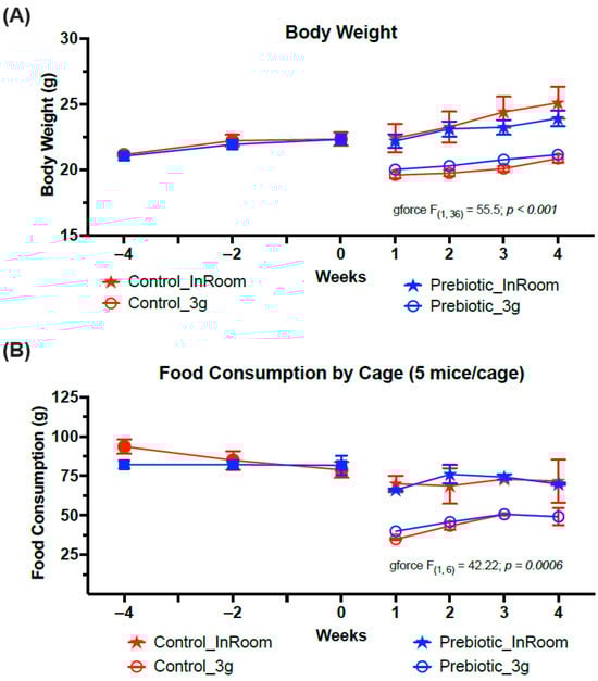 Consumption of the prebiotic diet did not affect body weight when compared to control diet consumption across weeks of the experiment, consistent with previous studies. Exposure to 3g produced a significant body weight reduction (F(1,36) = 55.5; p < 0.001, Figure 2A) and a significant reduction in food consumption regardless of diet (F(1,6) = 42.22; p < 0.001, Figure 2B). There were no significant time-by-diet or time-by-3g interactions.