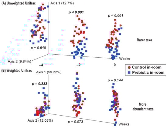 Beta diversity was examined with a principal coordinate analysis (PCoA) using unweighted Unifrac distances (sensitive to rarer taxa) and weighted Unifrac distances (sensitive to abundances of taxa), which are the best ways to visualize the microbiome community as a whole []. For the analysis, PERMANOVA was used at each time point in QIIME2. Alpha diversity is a within-samples measure and was examined using evenness, observed features, and Faith’s Phylogenetic Diversity or Faith_PD []. Differential abundance was assessed on the ASVs using an analysis of the composition of microbiomes (ANCOM) [] as implemented in QIIME2.