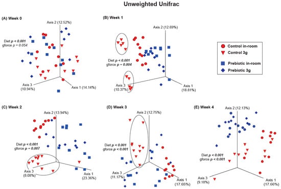β-diversity PERMANOVA analysis showing Unweighted Unifrac (rarer taxa) at Week 0 before exposure to 3g and Weeks 1–4 during continuous exposure to 3g. (A) There were no significant effects of 3g exposure at Week 0, but during Weeks (B) 1, (C) 2, and (D) 3, the control diet group exposed to 3g was altered (circles) when compared with the other groups. By (E) Week 4, this effect, although still significant, appears to have waned, while the effect of consuming prebiotic diet became more pronounced.