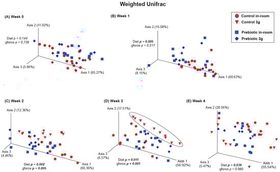 β-diversity PERMANOVA analysis showing Weighted Unifrac (more abundant taxa). (A) There were no significant effects of either prebiotic diet or 3g exposure at Week 0. (B) A significant effect of prebiotic diet on Weighted Unifrac emerged on experimental Week 1 (or 5 weeks total of consuming prebiotic diet), but there was still no effect of 3g exposure. Weighted Unifrac was significantly altered by both prebiotic diet and 3g exposure for Weeks (C) 2, and (D) 3, where, again, the control diet group exposed to 3g was altered (circle) when compared with the other groups. (E) Surprisingly, the prebiotic diet effect was less apparent, although still significant, by Week 4, while Weighted Unifrac failed to remain affected by continuous 3g exposure, thus revealing potential adaptations of higher abundance genera to chronic stress exposure.