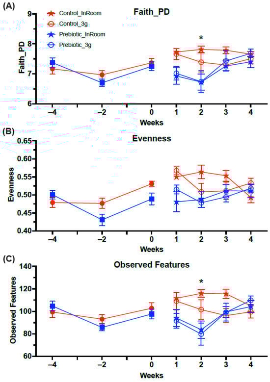 Alpha Diversity analyses across the experiment. (A) There was no effect of prebiotic diet on Faith_PD prior to 3g exposure, but mice eating prebiotic diet had significantly lower levels of Faith_PD in Week 2. (B) Evenness was significantly lower in the prebiotic diet groups both before and after exposure to 3g. Exposure to 3g also produced lower levels across time of Evenness in both diet groups. (C) The Observed Features were not different prior to 3g exposure, but there was a significant prebiotic diet effect in Week 5. The solid red circles represent control diet (n = 20) and solid blue squares represent prebiotic diet (n = 20) prior to 3g exposure. * p < 0.05 control, in-room vs. prebiotic, in-room.