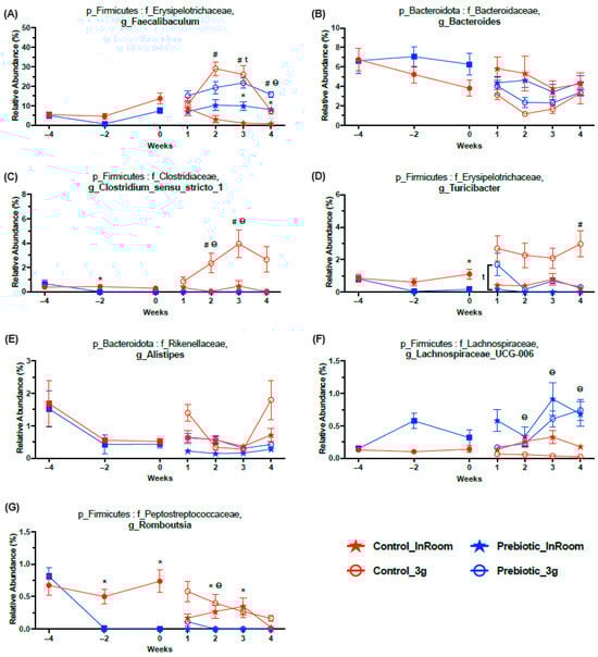 Relative abundance taxonomy data demonstrating the 7 genera most affected by 3g exposure (see Table 1 for statistics and figure for results of Tukey post-hoc analyses). (A) Exposure to 3g produced higher levels of Faecalibaculum in both diet groups primarily in Weeks 2 and 3. (B) In contrast, exposure to 3g produced lower levels of Bacteroides regardless of diet. (C) There was a protective effect of prebiotic diet on Clostridium_sensu_stricto_1, where this genus was higher in control diet mice exposed to 3g, an effect which was absent in prebiotic mice exposed to 3g. The genus also had somewhat lower levels in the prebiotic diet group (Week −2) prior to exposure to 3g. (D) Similarly, there was a protective effect of prebiotic diet on Turicibacter, where this genus was higher in control diet mice exposed to 3g, an effect which was attenuated, but not absent (Week 1), in prebiotic diet mice exposed to 3g. This genus also had lower levels in the prebiotic diet group (Week 0) prior to exposure to 3g. (E) The relative abundance of Alistipes was higher in mice eating control diet, and in all mice, exposed to 3g. (F) The relative abundance of Lachnospiraceae_UCG-006 was higher in mice eating prebiotic diet and lower in mice exposed to 3g. Although the relative abundance of this genus was higher overall in mice eating prebiotic diet, 3g exposure produced lower levels in the control diet mice, while the levels of this genus in 3g-exposed mice eating prebiotic diet were less affected (Weeks 2, 3, and 4). (G) Romboustia was lower in mice eating prebiotic diet and 3g produced higher levels of this genus, primarily in the control diet 3g-exposed mice (Week 2). The solid red circles represent control diet (n = 20) and solid blue squares represent prebiotic diet (n = 20) prior to 3g exposure. * p < 0.05 control, in-room vs. prebiotic, in-room; # p < 0.05 control, in-room vs. control, 3g; t p < 0.05 prebiotic, in-room vs. prebiotic, 3g; θ p < 0.05 control, 3g vs. prebiotic, 3g.