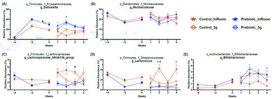 Relative abundance taxonomy data demonstrating 5 higher relative abundance genera significantly affected by prebiotic diet consumption and less affected by 3g exposure (see Table 1 for statistics and figure for results of Tukey post-hoc analyses). (A) Prebiotic diet consumption produced higher relative abundance levels in Dubosiella. (B) Muribaculaceae was slightly altered by prebiotic diet consumption, mostly varying across time, when compared to control diet. (C) The genus Lachnospiraceae_NK4A136_group had higher levels in the control diet groups, with 3g exposure producing lower levels in the control diet, 3g exposed group when compared to the control diet, in-room group. (D) Lactococcus also had higher levels in the control diet groups, with the control diet, in-room control diet group having the highest relative abundance levels compared to the other groups. (E) Finally, Bifidobacterium was higher in mice eating prebiotic diet when compared to mice eating control diet; however, 3g exposure produced dynamic changes as well. The solid red circles represent control diet (n = 20), and solid blue squares represent prebiotic diet (n = 20) prior to 3g exposure. * p < 0.05 control, in-room vs. prebiotic, in-room; # p < 0.05 control, in-room vs. control, 3g.