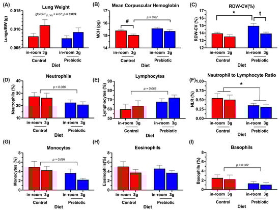 Significant terminal endpoint data (end of experimental Week 4) demonstrating main effects of prebiotic diet consumption and 3g exposure (see Table 2 for additional endpoint parameters that were not altered by either prebiotic diet or 3g, at the time measured). (A) Lung weights were higher in mice chronically exposed to 3g. (B) Dietary prebiotics modestly attenuated the 3g-induced decrease in mean corpuscular hemoglobin. (C) Mice eating prebiotic diet had higher levels of red blood cell distribution width, which was reversed upon exposure to 3g. All RDW-CV values measured were within the normal physiological range of 11–15%. There were trends towards prebiotic-induced decreases in (D) neutrophils, (G) monocytes, and (I) basophils, and a trend towards an increase in (E) lymphocytes. (F) There was a significant effect of dietary prebiotics lowering the neutrophil-to-lymphocyte ratio. (H) Eosinophils were unaffected by prebiotic diet. There were no effects of 3g exposure on the terminal white blood cell parameters measured. * p < 0.05 control, (in-room) vs. prebiotic, (in-room); # p < 0.05 control, in-room vs. control, 3g; t p < 0.05 prebiotic, in-room vs. prebiotic, 3g.