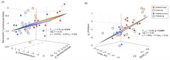 Based on the correlation matrix, there was a significant two-factor stepwise multiple regression between the NLR, the genus Faecalibaculum, and the genus Muribaculaceae (F(1,37) = 4.78; p = 0.014; Adj. r2 = 0.16; Figure 10A) which can be explained by the relationship: y = −0.073x1 − 0.501x2 + 0.524, where x1 = Faecalibaculum and x2 = Muribaculaceae. This relationship demonstrates that mice with a lower NLR (like those eating the prebiotic diet) tended to have higher levels of the genus Faecalibaculum (increased by 3g) and higher levels of Muribaculaceae. Based on both the correlation network and matrix, there was also a significant two-factor stepwise multiple regression between the genus Alistipes, the lung weight (corrected for body weight), and the RDW-CV (F(1,37) = 12.68; p = 0.0001; Adj. r2 = 0.38; Figure 10B), where those mice with higher levels of the Alistipes had higher Lung_BW values but lower RDW-CV values and were described by the relationship: y = 1.385x1–5.134x2 + 19.34, where x1 = Lung_BW and x2 = RDW-CV. It is also worth noting here that the lung weight, whether corrected for body weight or not, was still significantly correlated with the genus Alistipes (p < 0.0001), but body weight was not (see Supplementary Figure S3B).
