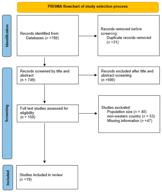 The database search yielded a total of 780 full-text articles, as illustrated in Figure 1. After removing 31 duplicates, 749 articles were screened by title and abstract, resulting in 590 exclusions based on predefined eligibility criteria. A total of 159 full-text articles were then assessed, of which 138 were excluded due to population mismatch (n = 40), studies conducted outside Western countries (n = 51), or lack of critical information (n = 47). This process resulted in 19 studies being included in the final review.