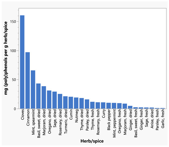 The current study focused upon total (poly)phenols consumed in herbs and spices as total (poly)phenols, but not (poly)phenol classes and subclasses, are consistently reported in Phenol-Explorer. (Poly)phenol classes and subclasses including phenolic acids (hydroxybenzoic and hydroxycinnamic acids), flavonoids (flavonols, flavones, isoflavonoids, flavanones, and anthocyanidins), lignans, and stilbenes have been identified in select herbs and spices, but comprehensive quantitative data for herbs and spices are not currently available [42,43,44,45,46,47]. Therefore, the (poly)phenol subclass intakes reported in this study are likely underestimates.