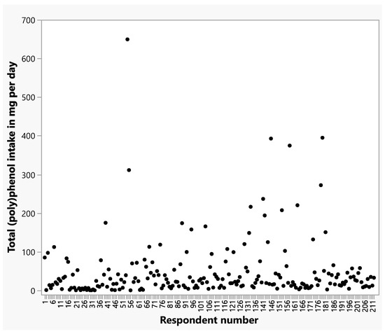 Scatter plot of total (poly)phenol intakes from herbs and spices per day per respondent.
