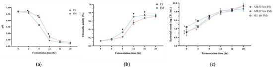 Changes in (a) pH value; (b) titratable acidity; and (c) viable bacterial count of different fermented milk products during fermentation. FS, Lc. lactis subsp. cremoris APL015 fermented milk; FM, mix of Lb. kefiranofaciens HL1 and Lc. lactis subsp. cremoris APL015 fermented milk. Asterisks (*) indicate significant differences between different products at each time point (p < 0.05), while different letters (a, b) indicate significant differences among samples within the same time point (p < 0.05). Data are shown as mean ± SD (n = 3).