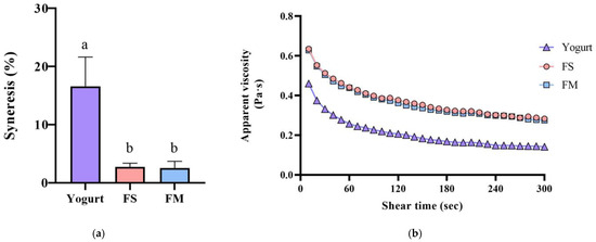 Syneresis (a) and apparent viscosity changes (b) of different fermented milk products. FS, Lc. lactis subsp. cremoris APL015 fermented milk; FM, mix of Lb. kefiranofaciens HL1 and Lc. lactis subsp. cremoris APL015 fermented milk. Different lowercase letters indicate significant differences among products (p < 0.05). Data are shown as mean ± SD (n = 3).